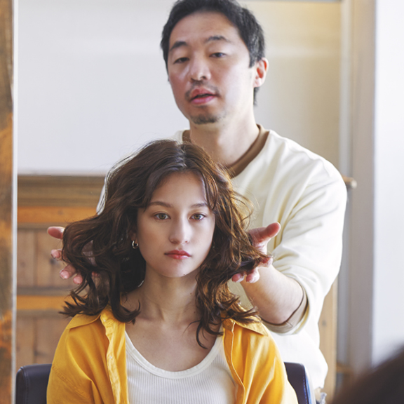 ストレートアイロンで挟んで、「上に起こす」「内に入れる」動作を繰り返して横波ウェーブに。カールアイロンと比較してより自然なクセを表現できます。根元にかけて細かく強めに巻くことで、トップにボリュームをもたせることがポイントです。深みのあるカラーが、エキゾチックな顔立ちを引き立てます。仕上げはバームミルクでツヤ感をプラス。柔らかな質感をキープします。