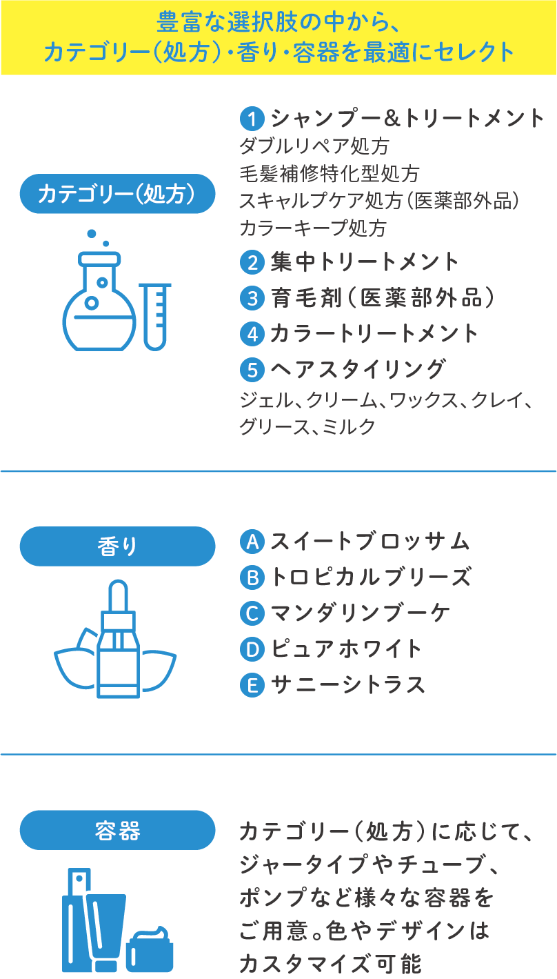 すでに耐内容物テストなどが完了しているカテゴリー(処方)・香り・容器を豊富な選択肢の中から自由に組み合わせることで、高品質な頭髪化粧品を迅速に開発いただけます。変化し続ける市場ニーズに柔軟に対応し、スピーディーな商品投入を実現します。