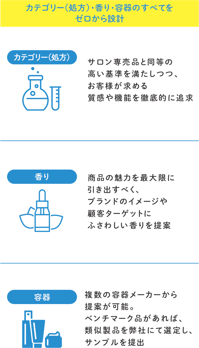お客様の想いにしっかり寄り添いながら、ブランドや製品の特性に合わせて、カテゴリー(処方)・香り・容器のすべてをゼロから設計。初回の打ち合わせから時間をかけて開発を進めることで、ご要望を細部に至るまで反映させた商品をワンストップで開発いただけます。